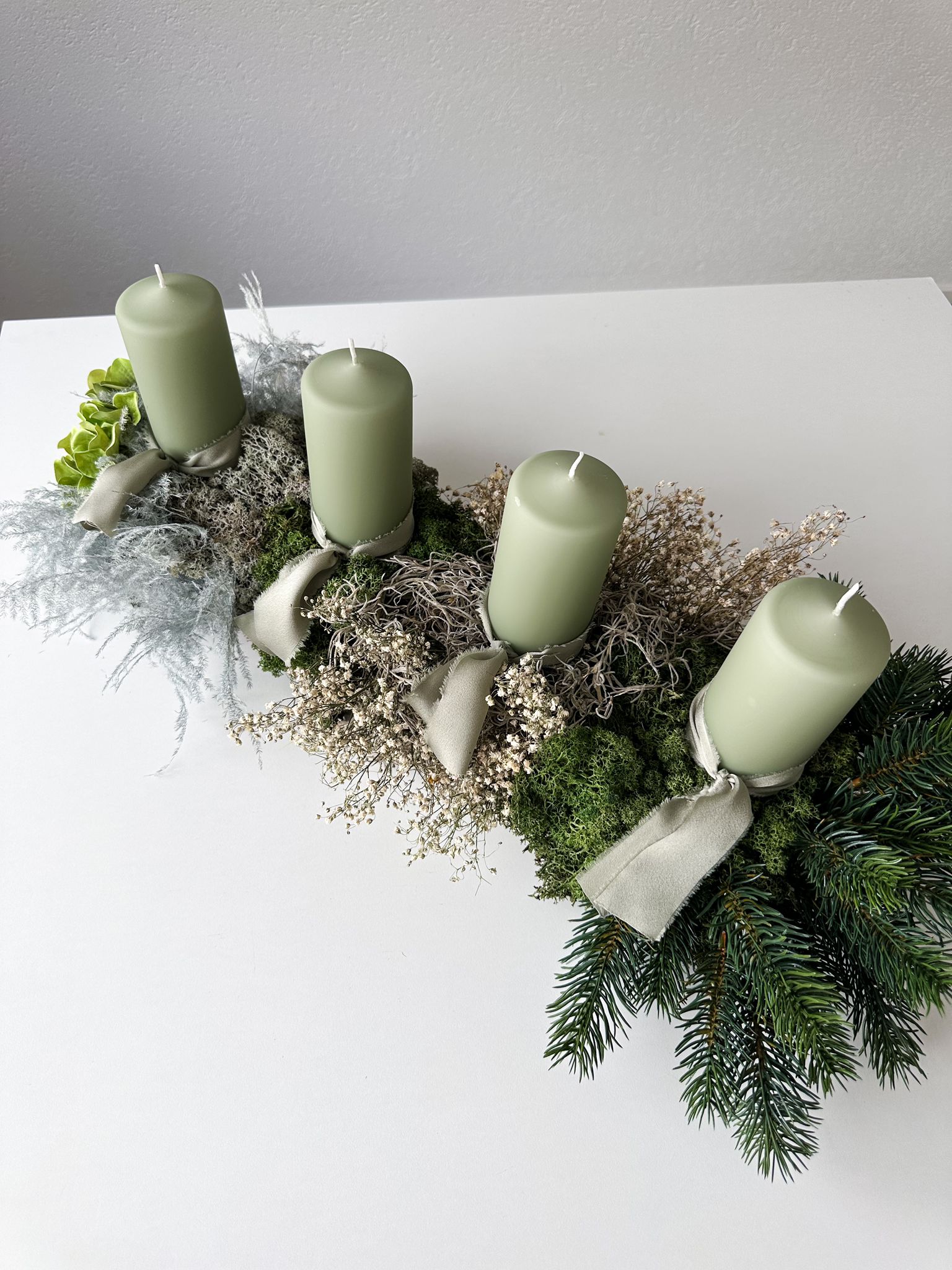 Das Adriana Adventsgesteck verbindet moderne Eleganz mit der sanften Wärme des Advents. In zarten Salbei- und Grüntönen gehalten, bringt es Ruhe und Harmonie auf jeden Tisch – ganz ohne Kitsch, dafür mit liebevollen Details und natürlicher Anmut.