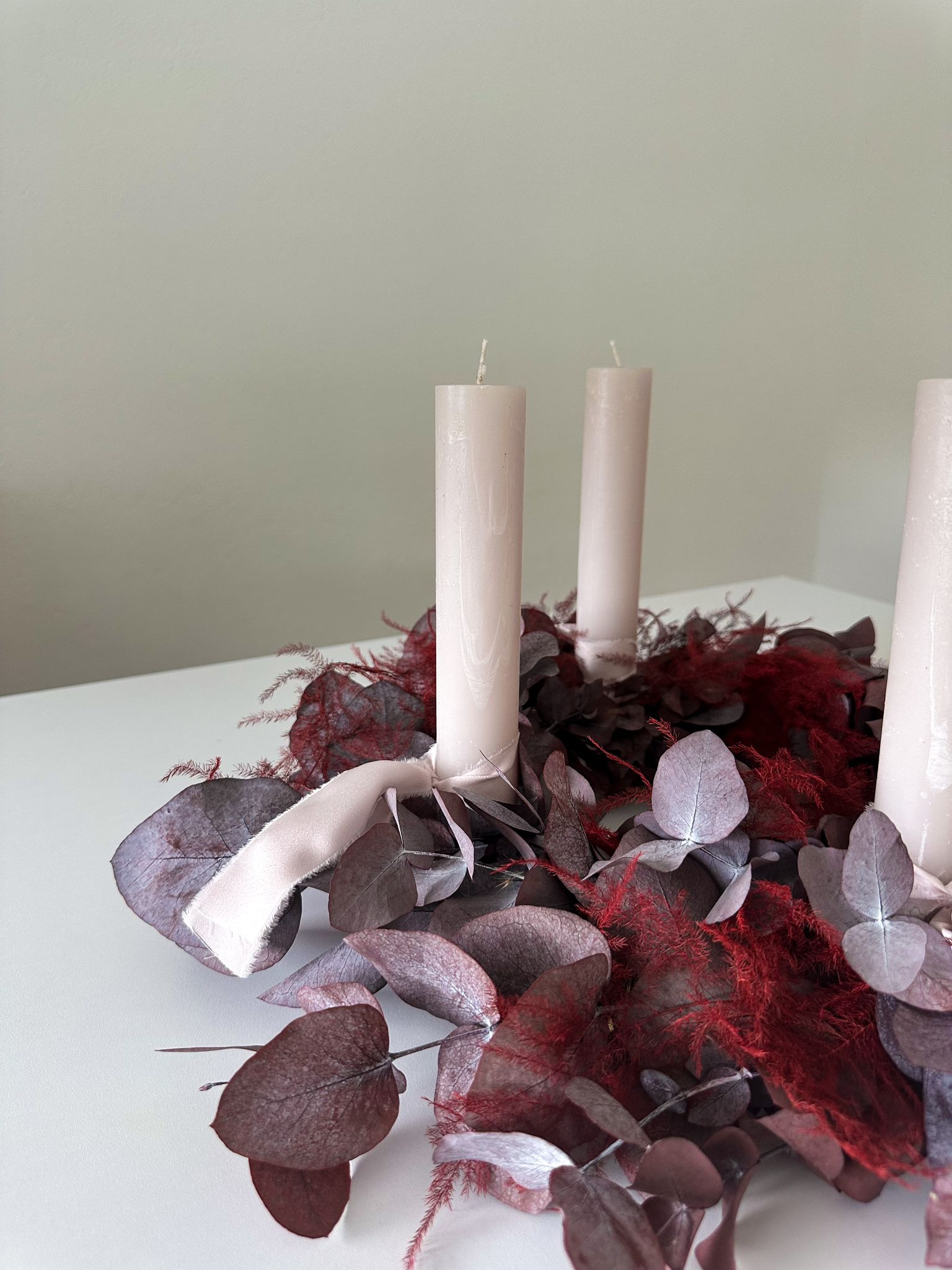Der Madlene Adventskranz vereint die Tiefe warmer Rot- und Violetttöne mit der Leichtigkeit zarter Pastellkerzen. Handgefertigt aus Eukalyptus und feinem Asparagus entsteht ein ausdrucksstarker Kranz, der zugleich ruhig und edel wirkt – ein Blickfang für jede stilvolle Adventsdekoration.