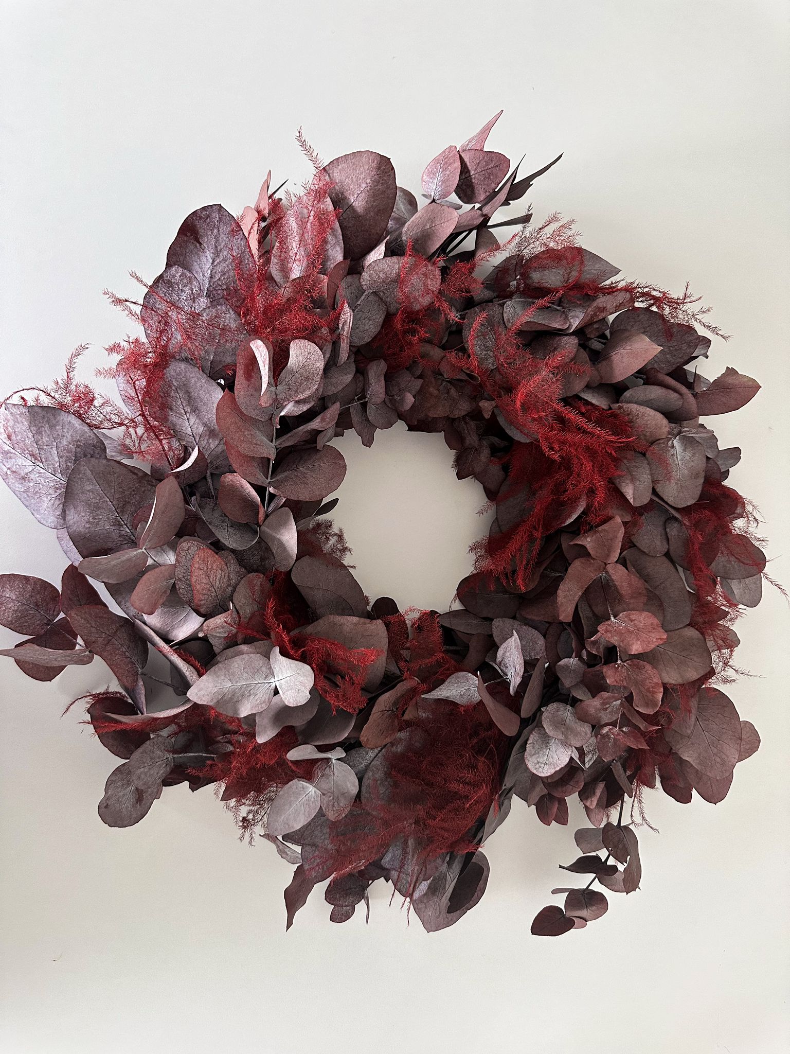- Natürlich & modern: Handgefertigt aus Eukalyptus und Asparagus – in tiefen, edlen Rottönen.